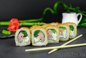 Вес: 320/240 гр. Фри-ролл с копченым беконом, нежным сливочным сыром и зеленым лучком.