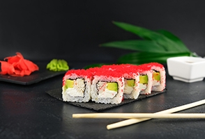 Вес: 299/200 гр. Классический ролл с авокадо, сливочным сыром, с сурими (имитация снежного краба). Покрыт с верху яркой икрой мосаго. Внимание!(цвет икры может меняться).