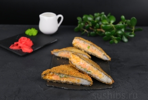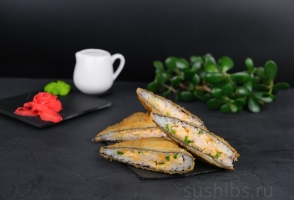 260 гр. Аппетитные треугольники в листе нори обжаренные во фритюре до хрустящей корочки,зеленый лучок с соусом ранч и много,много Лосося.