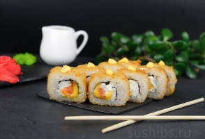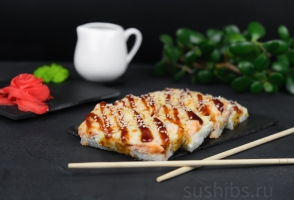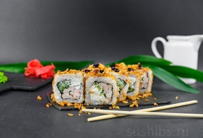 Запеченный ролл с аппетитной сырной шапкой с укропом ,сурими(имитация краба),свежим огурчиком,омлетом, и сливочным сыром украшен хрустящим лучком фри.