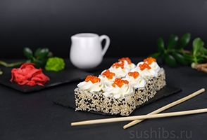 Вес:350/240гр.Нежное филе лосося,сливочный сыр,огурец,рис,нори,покрыт кунжутом,с верху шапка из сливочного сыра и икра лосося.